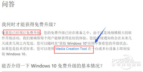步骤2、下边介绍都是在预定升级后的操作,如果没有预定,现在可能是不能升级的,因为官方给出了免费升级的条件是预定过的用户。下边是官方网站升级问答页面截图,可以看到可以下载Media Creation Tool 来帮助你系统升级。