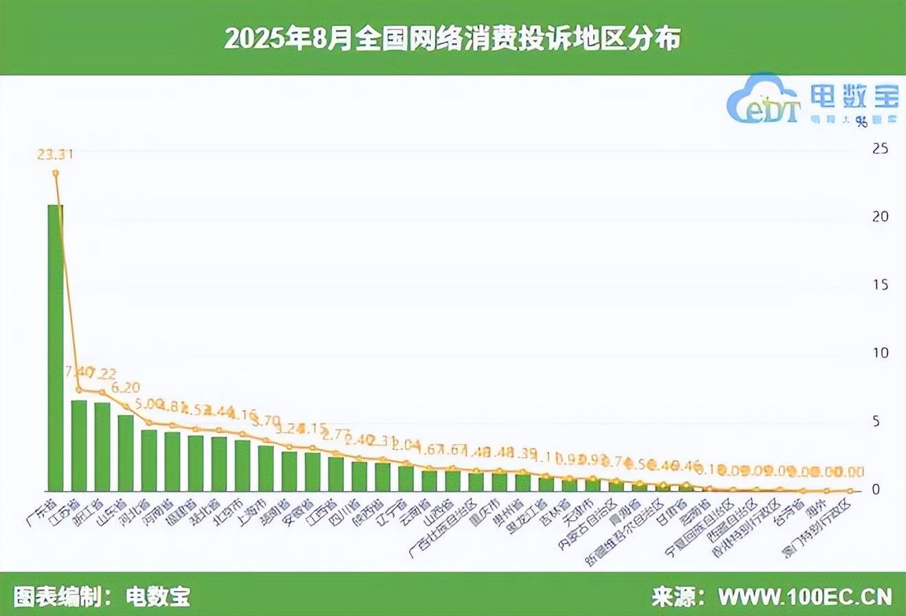 8月,“电诉宝”受理投诉用户聚集地区TOP10依次为广东省(23.31%)、江苏省(7.40%)、浙江省(7.22%)、山东省(6.20%)、河北省(5.00%)、河南省(4.81%)、福建省(4.53%)、湖北省(4.44%)、北京市(4.16%)。