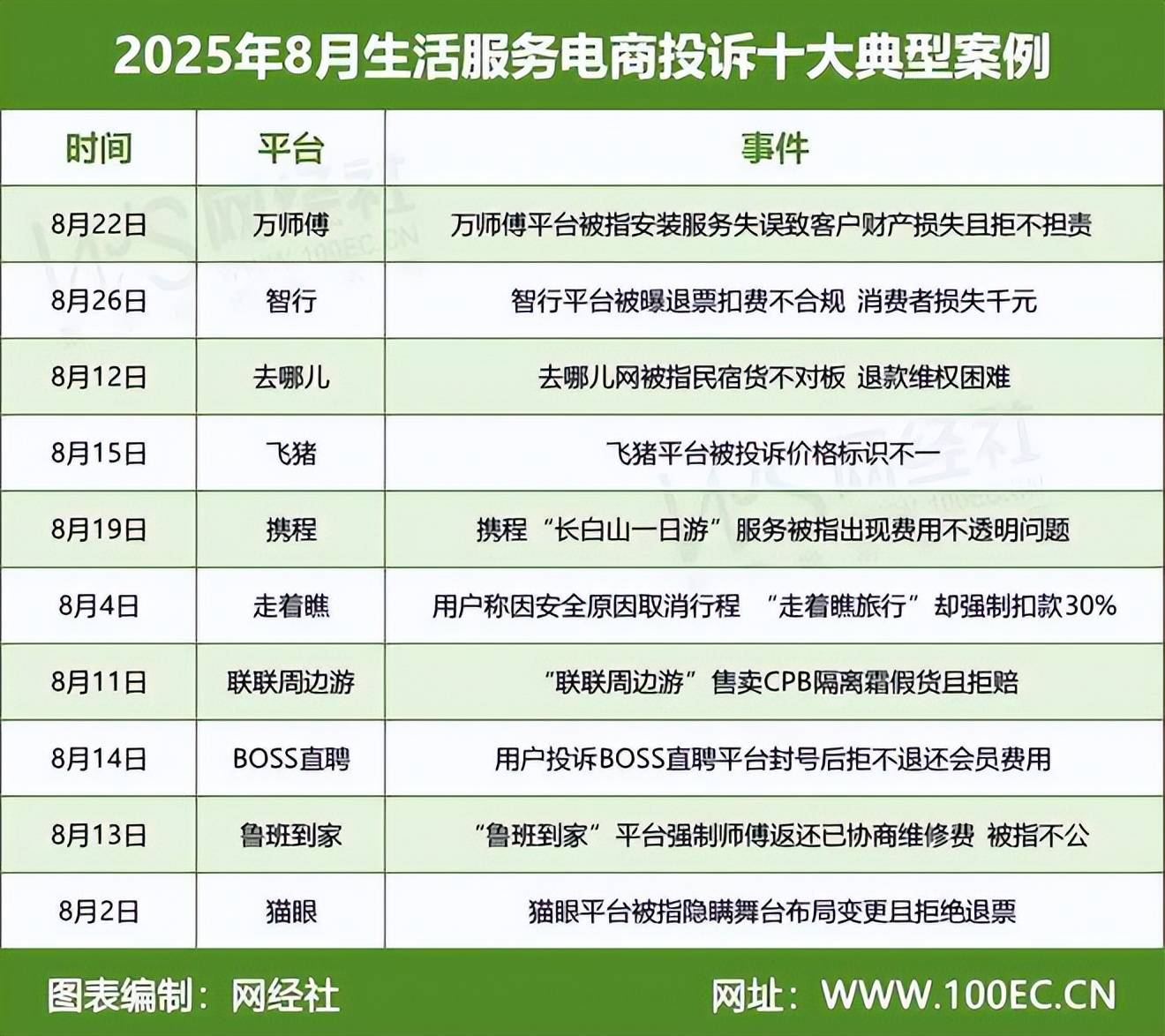 在生活服务电商消费领域,据“电诉宝”受理用户维权案例,我们从中选取十大典型投诉案例,涉及万师傅、智行、去哪儿、飞猪、携程、走着瞧、联联周边游、BOSS直聘、鲁班到家、猫眼。