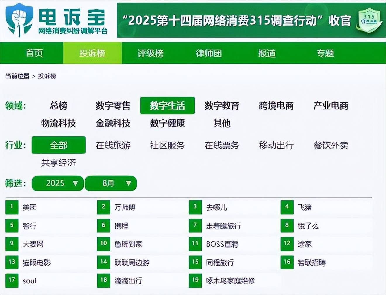 投诉量TOP10依次为:美团、万师傅、去哪儿、飞猪、智行、携程、走着瞧旅行、饿了么、大麦网、鲁班到家;