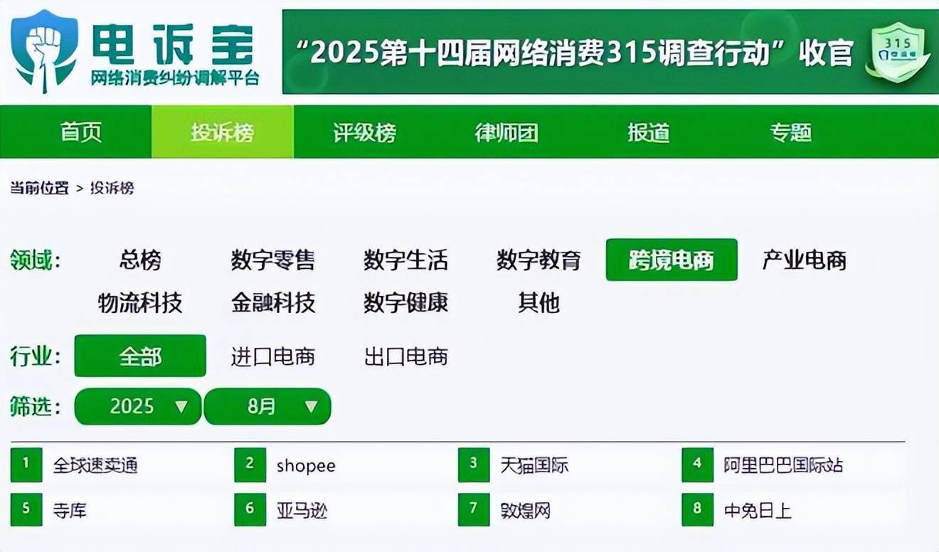 8月,用户投诉跨境电商上榜平台8家,依次为:全球速卖通、shopee、天猫国际、阿里巴巴国际站、寺库、亚马逊、敦煌网、中免日上。