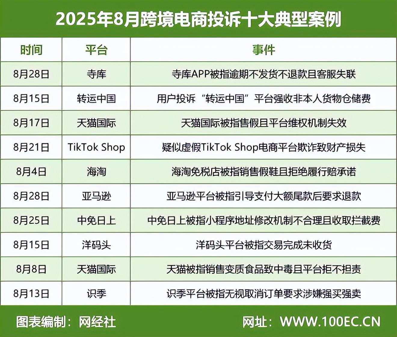 在跨境电商消费领域,据“电诉宝”受理用户维权案例,我们从中选取十大典型投诉案例,涉及寺库、转运中国、天猫国际、TikTok Shop、海淘、亚马逊、中免日上、洋码头、识季。
